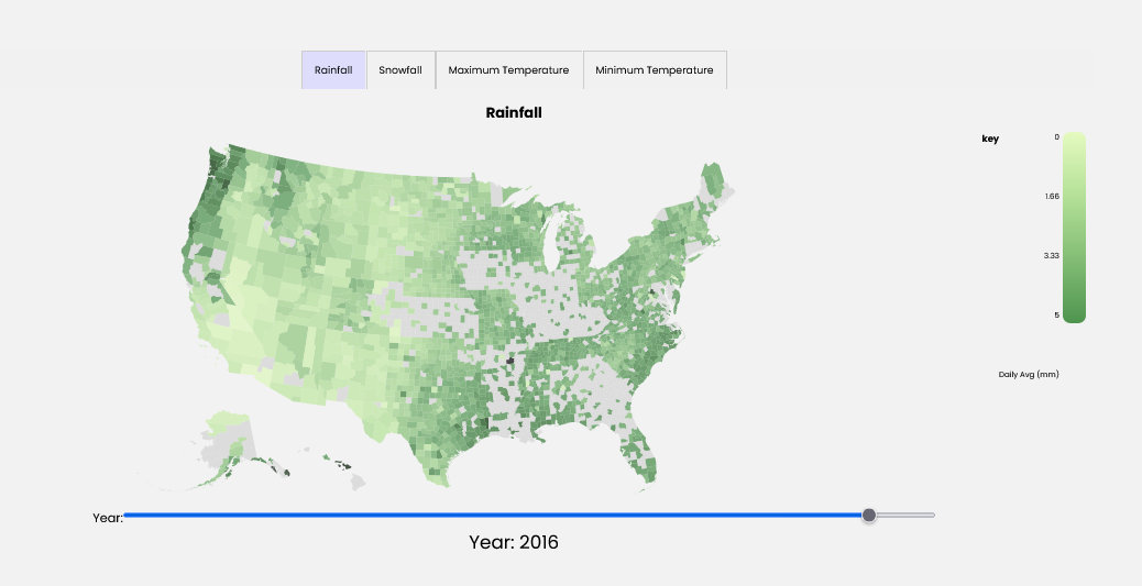 This is a project I worked on as part of my Senior Seminar in computer science. I compiled data from 70,000 of NOAA's weather stations going back to 1940 using Python and NOAA's API. This data consisted of various metrics, including maximum/minimum temperature, rainfall, and snowfall. My group and I then displayed that data using Next.js and React alongside the Nominatim OpenStreetMap API to map NOAA stations to specific counties.